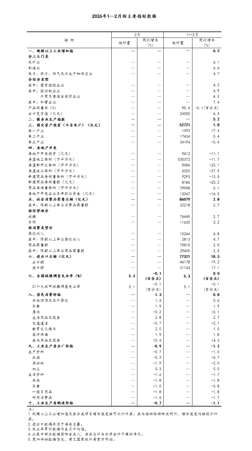中國(guó)網(wǎng)3月16日訊 國(guó)家統(tǒng)計(jì)局網(wǎng)站3月16日發(fā)布消息,1—2月份,在以習(xí)近平同志為核心的黨中央堅(jiān)強(qiáng)領(lǐng)導(dǎo)下,各地區(qū)各部門認(rèn)真落實(shí)黨中央、國(guó)務(wù)院決策部署,堅(jiān)持穩(wěn)中求進(jìn)工作總基調(diào),實(shí)施更加積極有為的宏觀政策,加大逆周期和跨周期調(diào)節(jié),持續(xù)擴(kuò)大內(nèi)需、優(yōu)化供給,做優(yōu)增量、盤活存量,生產(chǎn)供給增長(zhǎng)加快,市場(chǎng)需求穩(wěn)中有升,就業(yè)物價(jià)總體穩(wěn)定,新質(zhì)生產(chǎn)力成長(zhǎng)壯大,經(jīng)濟(jì)運(yùn)行起步有力,實(shí)現(xiàn)良好開局。