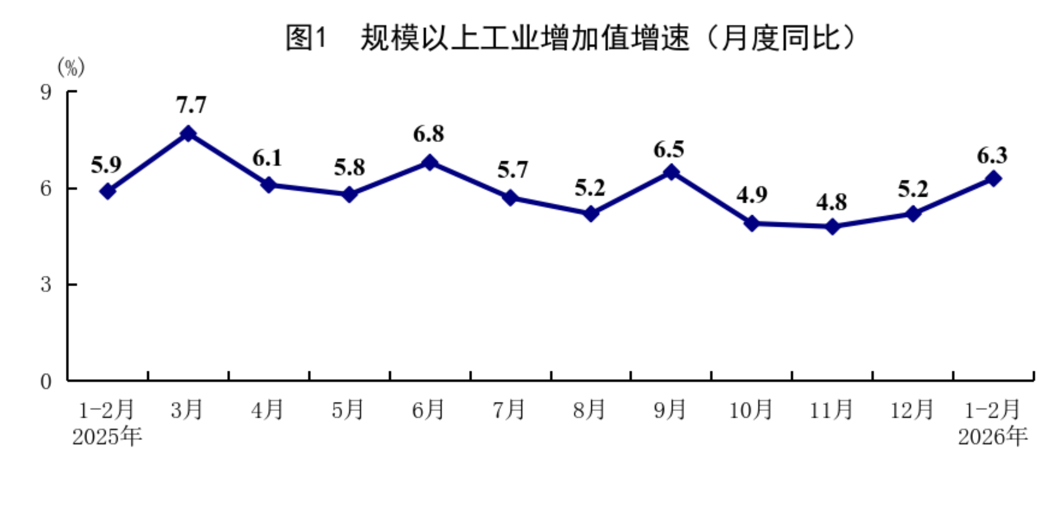 1—2月份,全國(guó)規(guī)模以上工業(yè)增加值同比增長(zhǎng)6.3%,比上年12月份加快1.1個(gè)百分點(diǎn)。分三大門類看,采礦業(yè)增加值同比增長(zhǎng)6.1%,制造業(yè)增長(zhǎng)6.6%,電力、熱力、燃?xì)饧八a(chǎn)和供應(yīng)業(yè)增長(zhǎng)4.7%。裝備制造業(yè)增加值同比增長(zhǎng)9.3%,高技術(shù)制造業(yè)增加值增長(zhǎng)13.1%,分別快于全部規(guī)模以上工業(yè)增加值3.0和6.8個(gè)百分點(diǎn)。分經(jīng)濟(jì)類型看,國(guó)有控股企業(yè)增加值同比增長(zhǎng)4.2%;股份制企業(yè)增長(zhǎng)6.9%,外商及港澳臺(tái)投資企業(yè)增長(zhǎng)4.0%;私營(yíng)企業(yè)增長(zhǎng)7.4%。分產(chǎn)品看,3D打印設(shè)備、鋰離子電池、工業(yè)機(jī)器人產(chǎn)品產(chǎn)量同比分別增長(zhǎng)54.1%、42.6%、31.1%。從環(huán)比看,2月份規(guī)模以上工業(yè)增加值比上月增長(zhǎng)0.83%。2月份,制造業(yè)采購(gòu)經(jīng)理指數(shù)為49.0%;企業(yè)生產(chǎn)經(jīng)營(yíng)活動(dòng)預(yù)期指數(shù)為53.2%,比上月上升0.6個(gè)百分點(diǎn)。