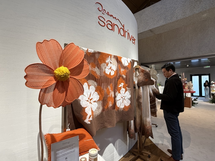 “踏花影”區(qū)域是一個(gè)五感體驗(yàn)的沉浸空間。藝術(shù)羊絨品牌Sandriver沙涓現(xiàn)場(chǎng)還原了日喀則羊絨氆氌工坊、果洛牦牛絨氆氌工坊的織機(jī)操作,匠人以雙手穿梭,在經(jīng)緯交錯(cuò)間演繹“高原的溫度”,消費(fèi)者能近距離觀看從捻紗到成胚的全過(guò)程,感受這一非物質(zhì)文化遺產(chǎn)的匠心精神。沙涓品牌負(fù)責(zé)人介紹,品牌將首發(fā)羊絨睡袍系列新品、馬年主題哈尼繡系列以及羊絨艾德萊斯家居毯等作品,展現(xiàn)傳統(tǒng)工藝與當(dāng)代生活美學(xué)融合的羊絨設(shè)計(jì)。
