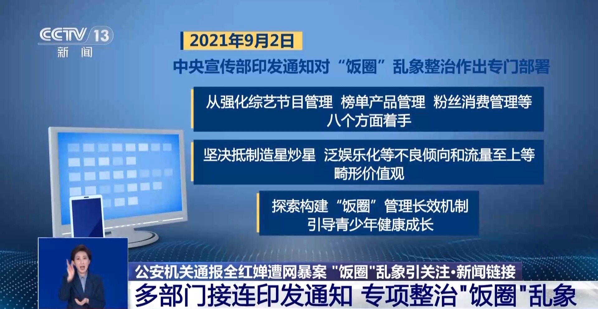 2021年9月2日,中央宣傳部印發(fā)通知對“飯圈”亂象整治作出專門部署。從強(qiáng)化綜藝節(jié)目管理、榜單產(chǎn)品管理、粉絲消費(fèi)管理等八個方面著手,堅決抵制造星炒星、泛娛樂化等不良傾向和流量至上等畸形價值觀,探索構(gòu)建“飯圈”管理長效機(jī)制,引導(dǎo)青少年健康成長。