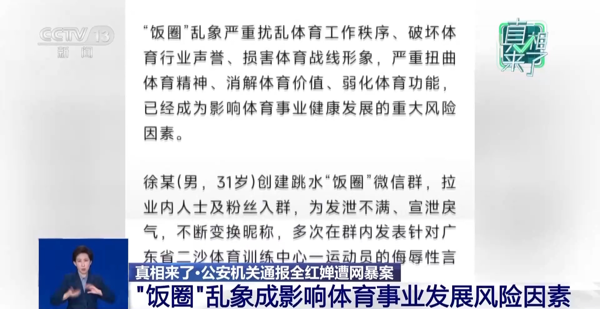 4月10日晚,公安部網(wǎng)安局就奧運(yùn)冠軍全紅嬋遭網(wǎng)絡(luò)暴力案發(fā)布通報,涉案人員徐某因在“飯圈”微信群惡意拉踩、發(fā)表侮辱言論,被公安機(jī)關(guān)依法行政拘留并處罰款。