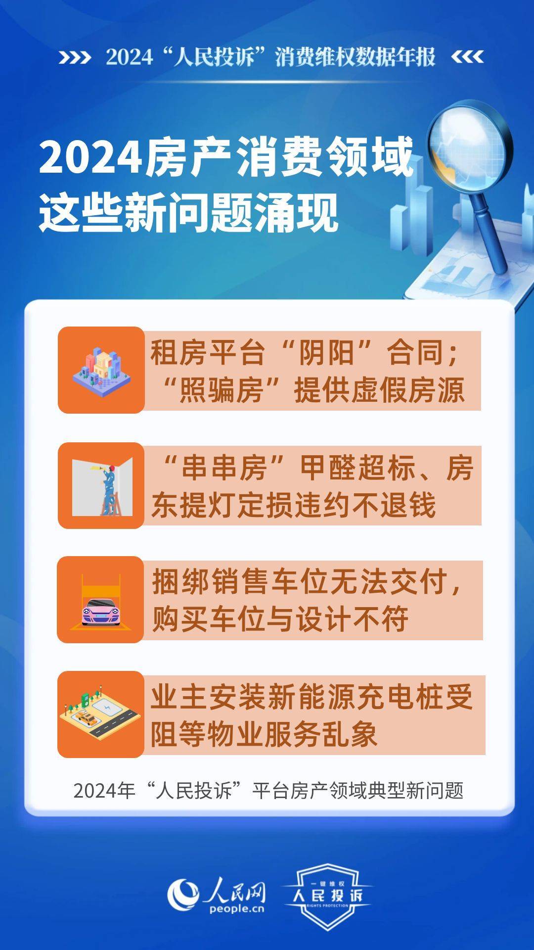 新問(wèn)題體現(xiàn)在:租房平臺(tái)“陰陽(yáng)”合同、提供虛假房源、甲醛超標(biāo)不退款、違約不退定金/押金等;捆綁銷(xiāo)售車(chē)位無(wú)法交付,購(gòu)買(mǎi)車(chē)位與設(shè)計(jì)不符,人防車(chē)位/不合格機(jī)械車(chē)位當(dāng)普通車(chē)位賣(mài),無(wú)法正常使用,業(yè)主安裝充電樁受阻等。