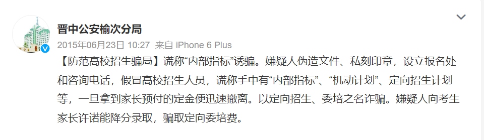 每年各省市投檔分數(shù)線公布后,總是“幾家歡喜幾家愁”,不法分子也在此刻瞄準了落榜考生。根據(jù)各地公安部門通報,一些不法分子假冒高校招生人員或聲稱“熟悉”高校招生辦,點對點與相關(guān)考生取得聯(lián)系。隨后謊稱有某高校的“內(nèi)部指標”“機動計劃”,或是以“定向招生”“委培招生”等名義“降分錄取”考生,誘騙其繳納相關(guān)費用。需要注意的是,在實施這些詐騙行為時,不法分子往往使用電腦合成技術(shù)偽造“招生文件”“學(xué)校公章”等,騙取考生及家長的信任。