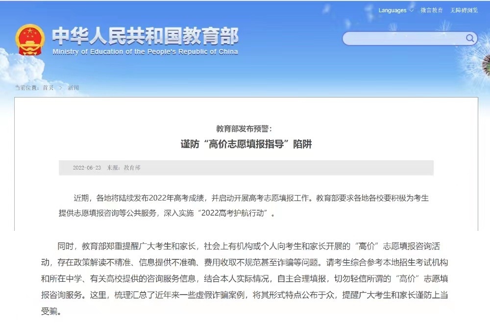近日,教育部發(fā)布預(yù)警,提醒考生謹防“高價志愿填報指導(dǎo)”陷阱。有網(wǎng)站虛假宣傳擁有所謂“內(nèi)部信息”,自稱掌握內(nèi)部大數(shù)據(jù),能夠“精準定位院校”等等。事實上,每年高考填報志愿前,各省級招生考試機構(gòu)都會發(fā)布當年高考成績統(tǒng)計情況和近年來各高校錄取分數(shù)情況,并不存在市面上的咨詢機構(gòu)或個人聲稱的“內(nèi)部信息”。還有一些咨詢機構(gòu)假冒所謂志愿填報專家身份。該咨詢機構(gòu)打出廣告,稱團隊的專家“獲得高考志愿規(guī)劃師認證”“來自著名高校”等。事實上,有關(guān)部門從未發(fā)放過“高考志愿規(guī)劃師”這類職業(yè)資格證書。該機構(gòu)一些所謂“志愿規(guī)劃師”都是臨時招募的社會人員,按照總部提供的“臺詞”給考生和家長輔導(dǎo)。家長購買這些機構(gòu)的服務(wù)不僅花了冤枉錢,而且可能報錯志愿。