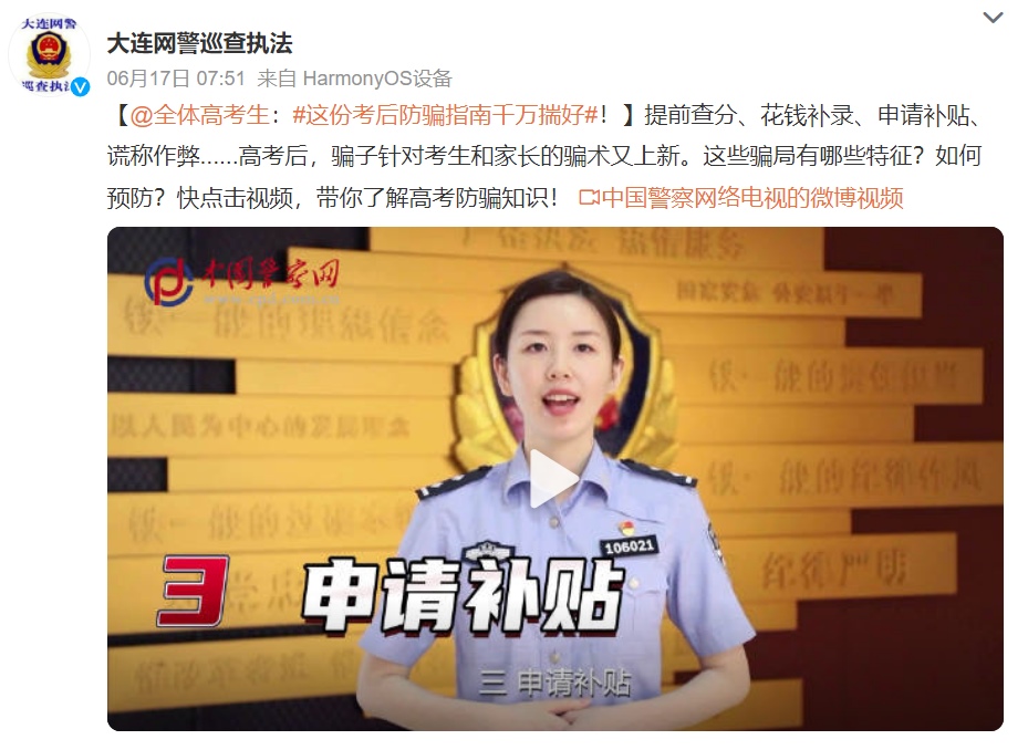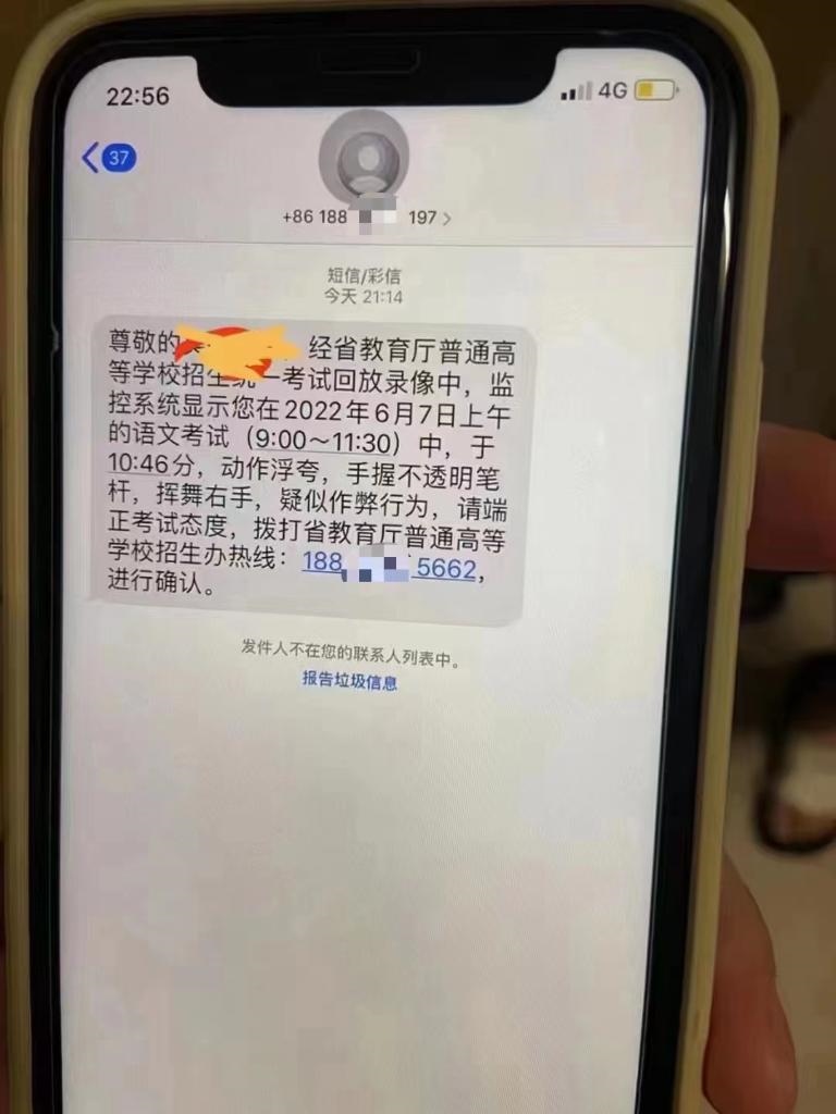 “尊敬的考生×××,經(jīng)省教育廳普通高等學(xué)校招生統(tǒng)一考試回放錄像中,監(jiān)控系統(tǒng)顯示您在2022年6月7日上午的語文考試(9:00—11:30)中,于10時46分,動作浮夸,手握不透明筆桿,揮舞右手,疑似作弊行為,請端正考試態(tài)度,撥打省教育廳普通高等學(xué)校招生辦熱線:188×××進行確認?!苯眨锌忌驈B門警方反映,自己接到了聲稱是“省教育廳普通高等學(xué)校招生辦”的通知短信,懷疑是詐騙信息。該短信在開頭準確寫明了考生姓名,并在結(jié)尾要求考生主動撥電話號碼進行確認。經(jīng)與教育部門核實確認,高考作弊違規(guī)行為不會以短信、電話、鏈接等方式通知。廈門警方提醒,不法分子通過非正常渠道搜集到考生信息,并向考生發(fā)送所謂“疑似作弊”的通知短信,考生一旦回撥電話,就可能被不法分子以“處理作弊行為”為由實施詐騙?! ?/p>