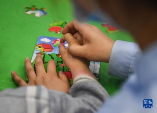 3月30日,在西安市金色陽光康復(fù)中心,特教老師指導(dǎo)孩子練習(xí)拼圖。