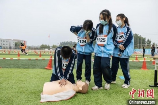 在“紅氣球校園挑戰(zhàn)賽”上,學(xué)生參與完成骨折固定、海姆立克急救法、心肺復(fù)蘇等技能操作 中國紅基會(huì) 供圖