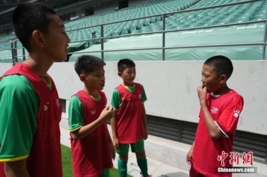 這是孩子們第一次在大型體育場(chǎng)上踢球。教練東周文德說(shuō),來(lái)北京前,孩子們問(wèn)他,“C羅踢球的那種球場(chǎng)在哪?”“工體里面的草都是真草嗎?”