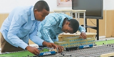 在位于吉布提首都吉布提市的吉布提工商學(xué)校,學(xué)生在魯班工坊鐵道運(yùn)營沙盤教學(xué)區(qū)學(xué)習(xí)。 新華社發(fā)