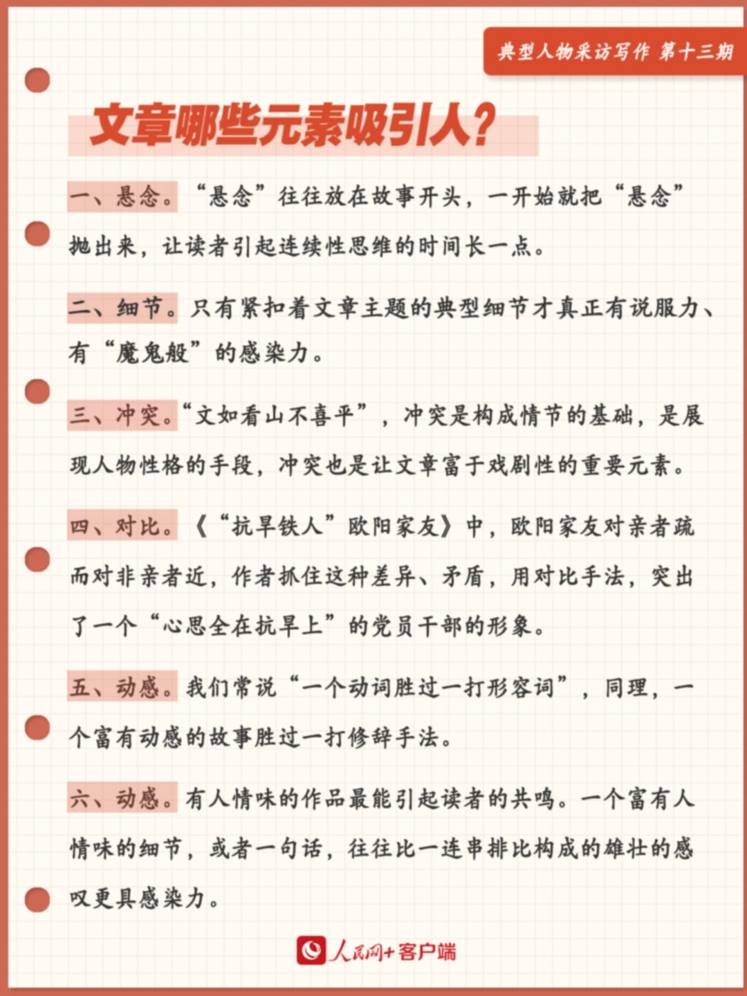 元素不是部件,一篇好看的稿件,也許只需用好一兩個(gè)元素,也許得多種元素交替運(yùn)用。上述梳理只涉及部分元素,倘若全面分析文章抓人的元素,還有很多。