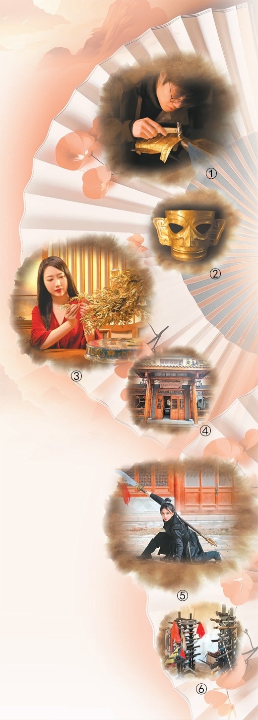 | 圖①:王莘閣在工作。圖②:王莘閣復(fù)刻的三星堆黃金面具。圖③:雁鴻展示她制作的工藝品。圖④:雁鴻國風(fēng)研習(xí)技藝館。圖⑤:張含亮在進(jìn)行武術(shù)視頻拍攝。圖⑥:張含亮拍攝用的兵器道具。本文照片由受訪者提供潘旭濤制圖 |