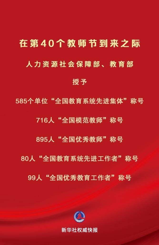 在中華人民共和國(guó)成立75周年和第40個(gè)教師節(jié)到來(lái)之際,為大力弘揚(yáng)教育家精神,營(yíng)造全社會(huì)尊師重教濃厚氛圍,激勵(lì)全國(guó)廣大教師和教育工作者落實(shí)立德樹(shù)人根本任務(wù),積極投身教育強(qiáng)國(guó)建設(shè),人力資源社會(huì)保障部、教育部決定授予中央財(cái)經(jīng)大學(xué)金融學(xué)院等585個(gè)單位“全國(guó)教育系統(tǒng)先進(jìn)集體”稱號(hào);授予刁榮春等716名同志“全國(guó)模范教師”稱號(hào);授予于淵等895名同志“全國(guó)優(yōu)秀教師”稱號(hào);授予王彥平等80名同志“全國(guó)教育系統(tǒng)先進(jìn)工作者”稱號(hào);授予王軍等99名同志“全國(guó)優(yōu)秀教育工作者”稱號(hào)。