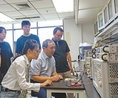 北京郵電大學(xué)多頻微波通信技術(shù)團隊的劉元安教授(右二)指導(dǎo)學(xué)生開展科研工作。唐玉嬋攝(人民視覺)
