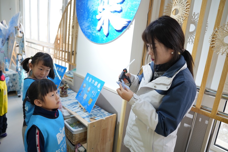 劉曉菲表示,利用幼兒園走廊寬的優(yōu)勢,把一樓打造成閱讀長廊,二樓藝術(shù)長廊,包括扎染、剪紙、造紙、拓印等非遺項目,三樓創(chuàng)造長廊,包括卡卡建構(gòu)、炫彩建構(gòu)、扭扭建構(gòu)、墻釘游戲、機(jī)械探索等。