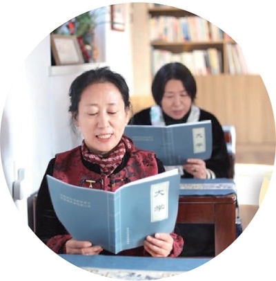 龍口市老年大學(xué)國(guó)學(xué)班的學(xué)員在課堂上誦讀《大學(xué)》。
