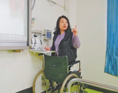 因為無法行走,王秀穎上課只能依靠輪椅。為了不影響教學(xué),她把輪椅滑到幻燈機前,跪在輪椅上,找到合適的高度,一邊講解,一邊演算、書寫。