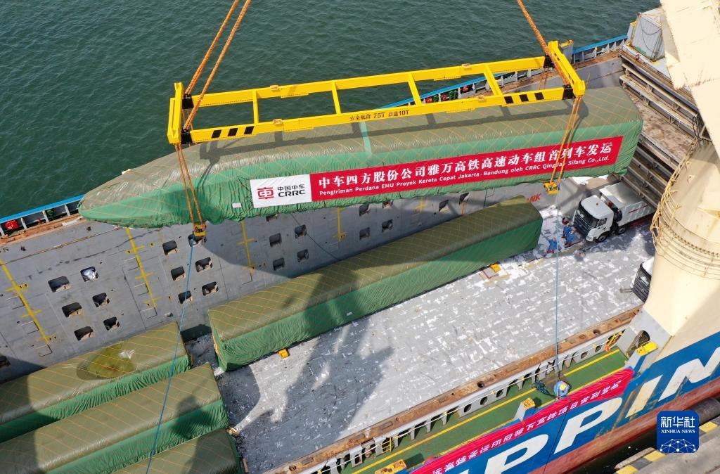 8月21日,我國(guó)出口印尼用于雅萬(wàn)高鐵的1組高速動(dòng)車(chē)組和1組綜合檢測(cè)列車(chē)在山東港口青島港完成裝船,通過(guò)海運(yùn)發(fā)往印尼。