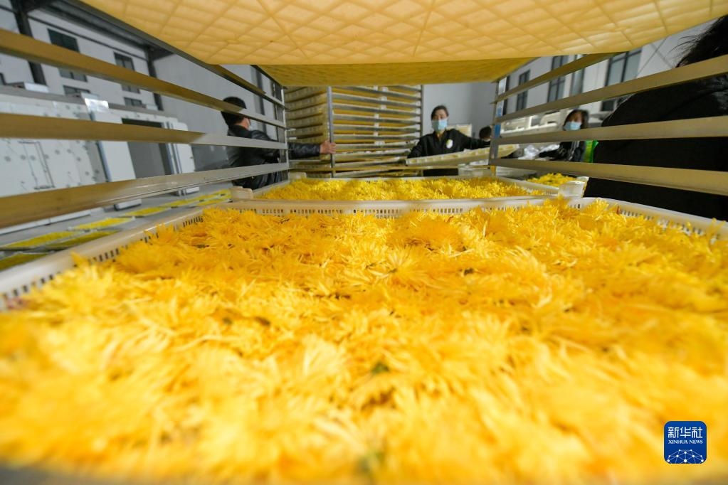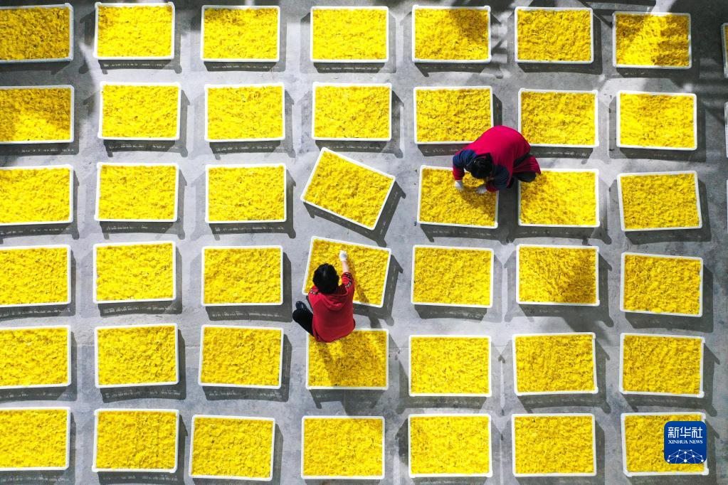 金秋時(shí)節(jié),貴州省黔南布依族苗族自治州貴定縣云霧鎮(zhèn)種植的1000余畝菊花陸續(xù)進(jìn)入采摘期,當(dāng)?shù)卮迕衩χ烧⒎謷?、烘干菊花,供?yīng)市場。