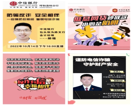 疫情期間,中信銀行呼和浩特分行各經(jīng)營機構(gòu)積極開展線上反詐宣傳,通過朋友圈、公眾號及線上直播活動積極開展金融反詐宣傳,切實提升金融客戶識別詐騙手段的能力和防范金融風險的意識。