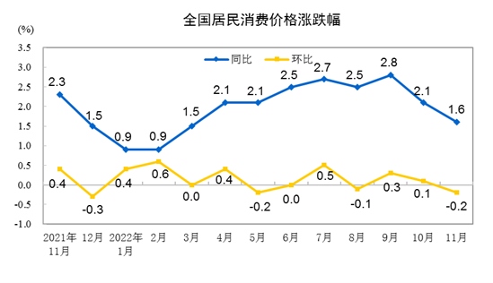 國家統(tǒng)計(jì)局今日發(fā)布數(shù)據(jù)顯示,2022年11月份,全國居民消費(fèi)價(jià)格同比上漲1.6%。其中,城市上漲1.5%,農(nóng)村上漲1.7%;食品價(jià)格上漲3.7%,非食品價(jià)格上漲1.1%;消費(fèi)品價(jià)格上漲2.3%,服務(wù)價(jià)格上漲0.5%。1-11月平均,全國居民消費(fèi)價(jià)格比上年同期上漲2.0%。