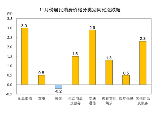 11月份,全國居民消費(fèi)價(jià)格環(huán)比下降0.2%。其中,城市下降0.2%,農(nóng)村下降0.2%;食品價(jià)格下降0.8%,非食品價(jià)格持平;消費(fèi)品價(jià)格下降0.1%,服務(wù)價(jià)格下降0.2%。