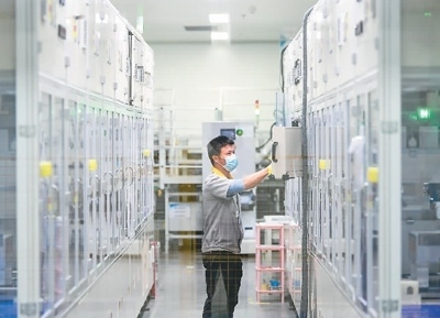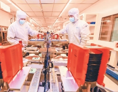 2023年2月16日,在安徽省馬鞍山市經(jīng)濟(jì)開發(fā)區(qū)檳城電子有限公司半導(dǎo)體芯片生產(chǎn)線上,職工在趕制應(yīng)用于5G基站上的半導(dǎo)體芯片。王文生攝(人民圖片)