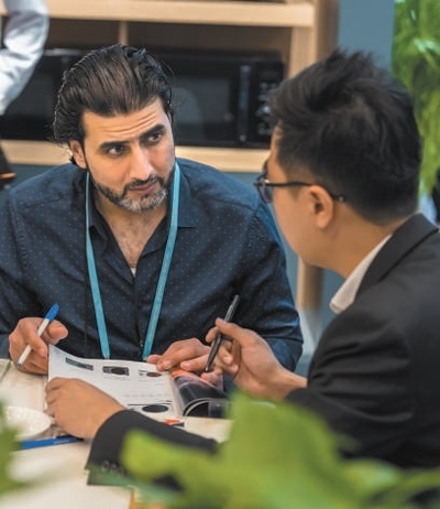 采購(gòu)商(左)與參展商在洽談業(yè)務(wù)。