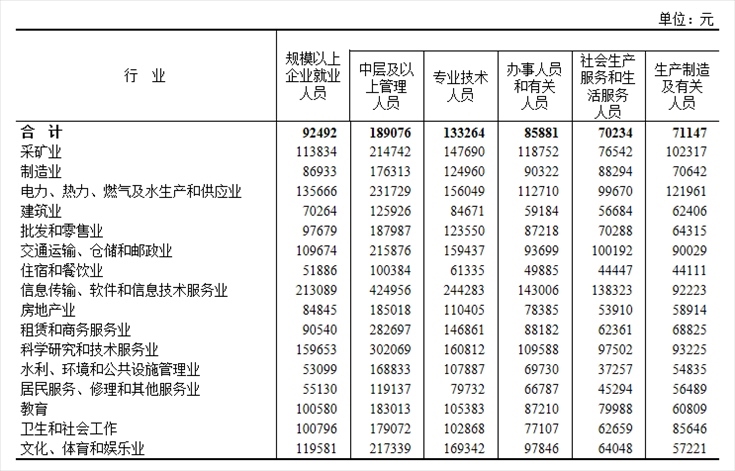 2022年全國規(guī)模以上企業(yè)就業(yè)人員年平均工資為92492元,比上年名義增長5.0%。其中,中層及以上管理人員189076元,增長4.7%;專業(yè)技術(shù)人員133264元,增長6.6%;辦事人員和有關(guān)人員85881元,增長4.1%;社會生產(chǎn)服務和生活服務人員70234元,增長3.3%;生產(chǎn)制造及有關(guān)人員71147元,增長3.9%。