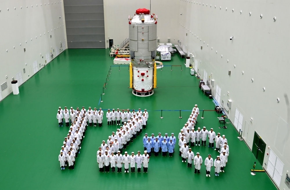天舟六號貨運飛船八院試驗隊和天舟六號推進艙合影。(中國航天科技集團八院供圖)