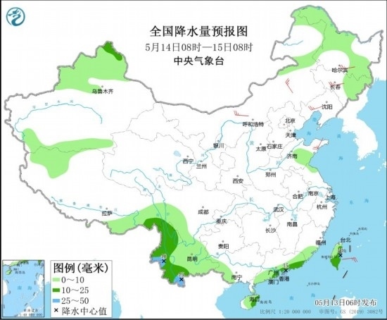 全國(guó)降水量預(yù)報(bào)圖(5月13日08時(shí)-14日08時(shí))