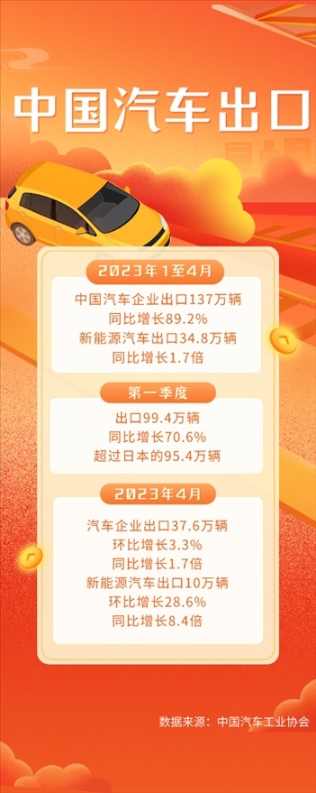中國汽車工業(yè)協(xié)會的統(tǒng)計數(shù)據(jù)顯示,今年第一季度,國內(nèi)汽車企業(yè)出口99.4萬輛,同比增長70.6%,超過日本的95.4萬輛。最新數(shù)據(jù)顯示,4月份,出口37.6萬輛,同比增長1.7倍,其中,電動、混動等新能源汽車出口10萬輛,環(huán)比增長28.6%,同比增長8.4倍,保持良好勢頭。