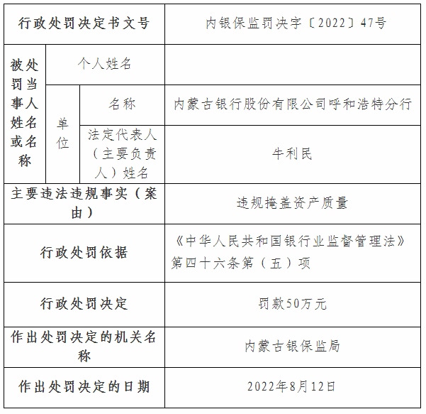 班文慧、宋建軍作為內(nèi)蒙古銀行呼和浩特分行違規(guī)掩蓋資產(chǎn)質(zhì)量責任人,被處以警告。