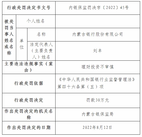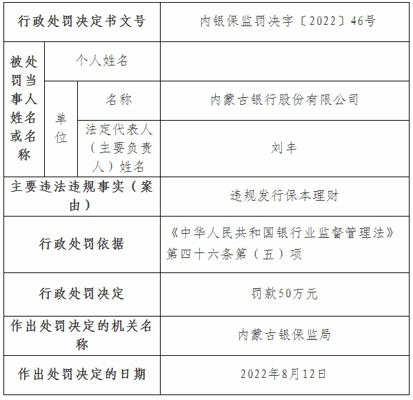 其中內(nèi)銀保監(jiān)罰決字〔2022〕44號、45號、46號行政處罰信息公開表顯示,內(nèi)蒙古銀行因關聯(lián)方授信集中度超比例、理財投資不審慎、違規(guī)發(fā)行保本理財,分別被罰款50萬元、30萬元、50萬元;內(nèi)銀保監(jiān)罰決字〔2022〕47號行政處罰信息公開表顯示,內(nèi)蒙古銀行呼和浩特分行違規(guī)掩蓋資產(chǎn)質(zhì)量,被罰款50萬元;內(nèi)銀保監(jiān)罰決字〔2022〕48號行政處罰信息公開表顯示,內(nèi)蒙古銀行小企業(yè)金融服務中心因違規(guī)轉(zhuǎn)嫁成本,被罰款330萬元。