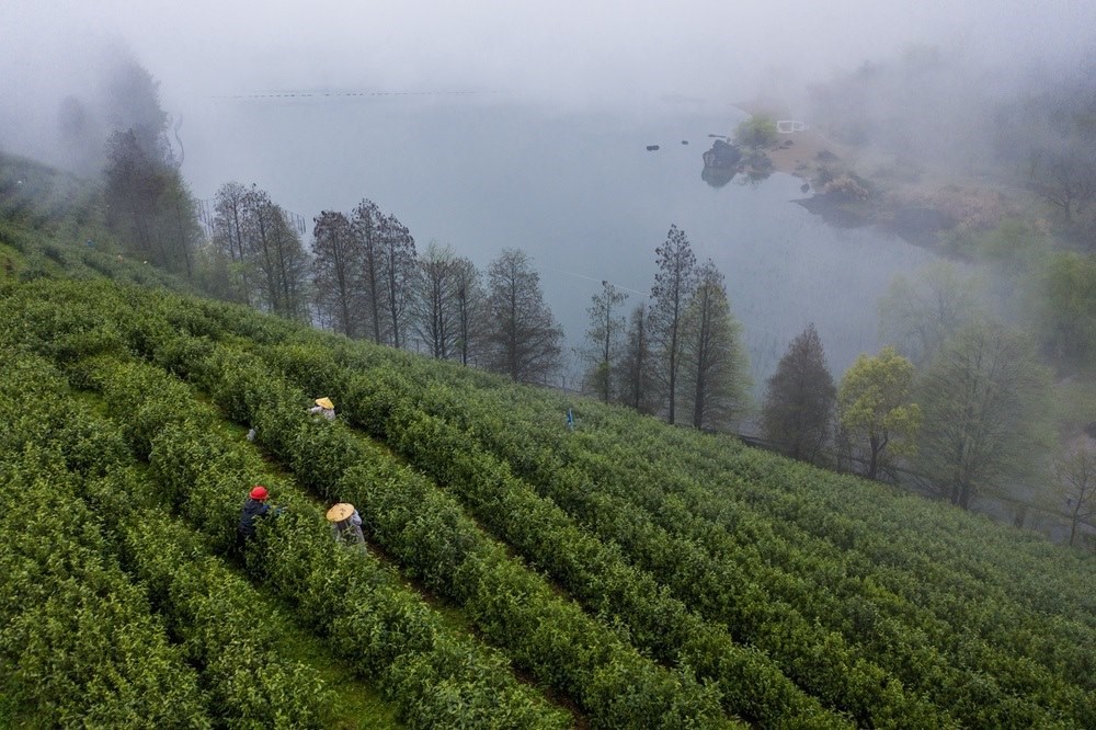 2024年4月7日,在位于浙江省金華市金華山鹿田村的婺州舉巖茶基地,茶農(nóng)在采摘舉巖茶鮮葉,發(fā)展特色茶產(chǎn)業(yè)是推動當?shù)匕傩展哺坏闹匾緩街唬o人機照片)。新華社記者 徐昱 攝
