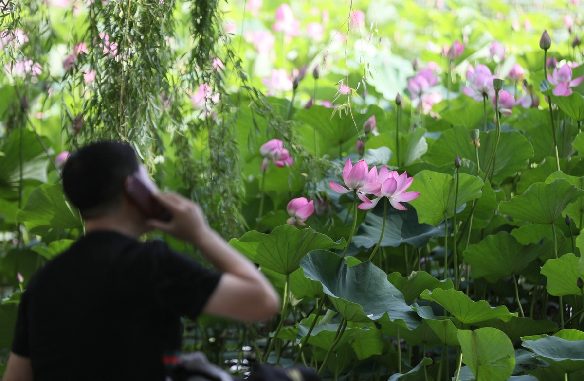 7月8日,呼和浩特青城公園的荷花盛開,游客紛紛打開拍照。