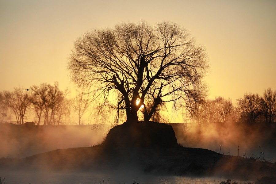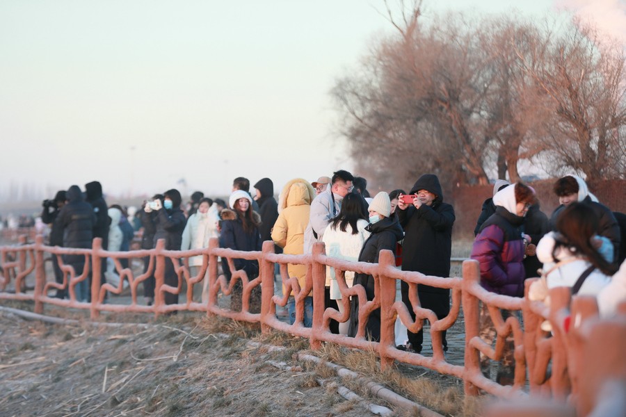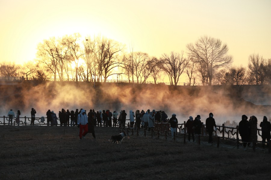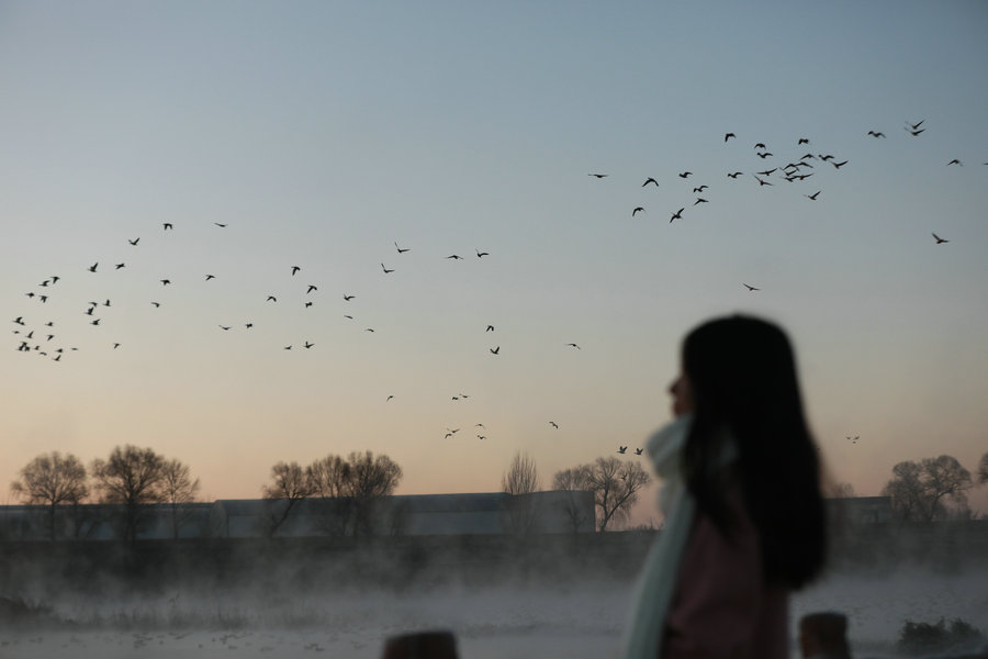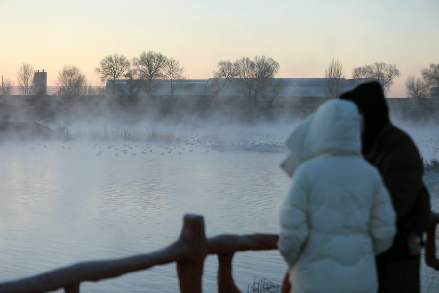 12月15日清晨,上千名游人在呼和浩特玉泉區(qū)班定營村南側(cè)的塞外“千島湖”畔賞景打卡。此處湖水為城市污水經(jīng)處理達標后的再生水,隆冬時節(jié),再生水流入湖中,水汽蒸騰,岸邊草木霧凇皚皚,良好的生態(tài)吸引了數(shù)萬只赤麻鴨在此翔集棲息,構(gòu)成一幅生動和諧的美麗畫面。每日清晨,都有上千名游客來此觀日出賞美景。