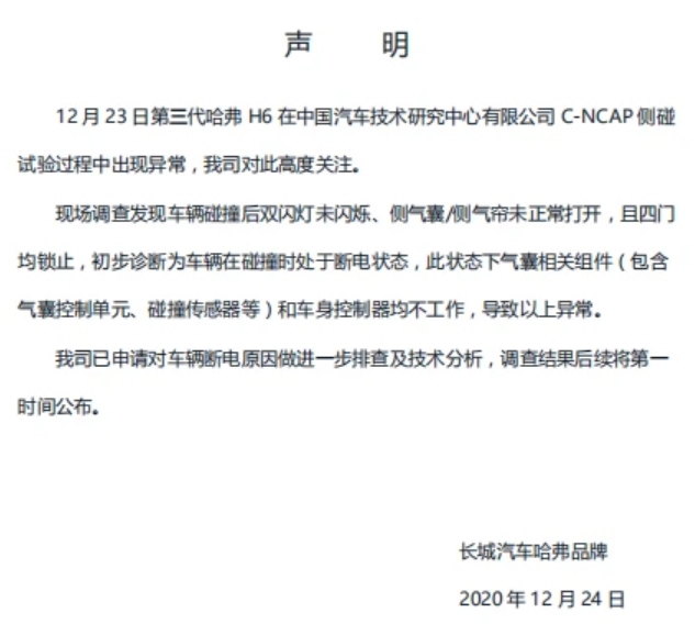 針對此碰撞結(jié)果,長城汽車給出了官方聲明,稱初步診斷為車輛在碰撞時處于斷電狀態(tài),導(dǎo)致以上異常。具體內(nèi)容如下: