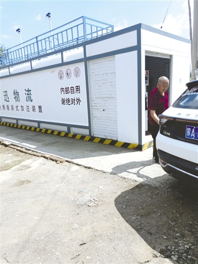 6月29日16時(shí)許,記者來(lái)到回民區(qū)塞外安康新居小區(qū)。該小區(qū)旁邊是一處老舊廠區(qū)。記者開車進(jìn)入這個(gè)老舊廠區(qū)看到,在大門的左手邊有一臺(tái)撬裝式加注裝置。這時(shí),一名中年婦女告訴記者,加油往里走,這臺(tái)裝置壞了。隨后,記者開車又往廠區(qū)院里走了約50米,在路的右側(cè)有一臺(tái)撬裝式加注裝置,這臺(tái)裝置距離塞外安康新居小區(qū)的居民樓很近(如圖二)。記者把車停在加注裝置旁邊,一位老人熟練地打開車的油箱蓋,問(wèn)記者加多少錢的油。加油過(guò)程中,老人告訴記者,“這個(gè)撬裝式加注裝置是向安監(jiān)部門申請(qǐng)的,供單位內(nèi)部用油。”記者詢問(wèn):“既然是供單位內(nèi)部使用,那對(duì)外加油不怕被查?”老人說(shuō):“執(zhí)法部門查不查,那是老板的事兒。因?yàn)橛捅阋?,?lái)這里加油的人不少?!边@里92號(hào)汽油每升為4.3元。