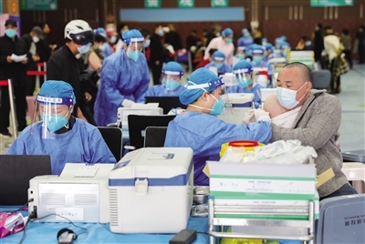 在接種臺(tái)前,醫(yī)護(hù)人員分工明確,核驗(yàn)接種人群身份信息、詢問病史和疫苗接種情況,每個(gè)環(huán)節(jié)有條不紊地進(jìn)行著。