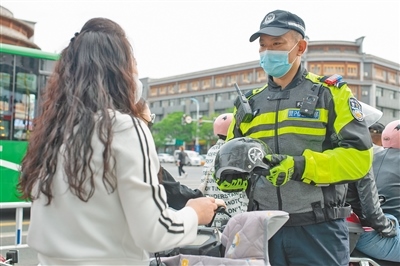 袁超勸導騎行電動車的市民佩戴頭盔