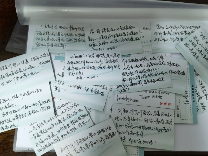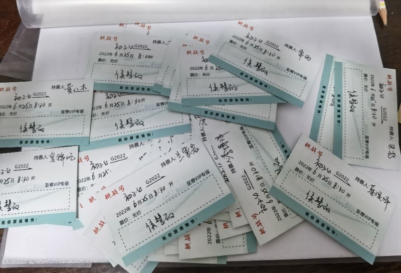 6月20日,呼和浩特市第五中學(xué)初三(4)班班主任侯慧敏老師給班里57名學(xué)生的手寫“告別信”刷屏朋友圈,紙短情長,愛意滿滿。每封信箋做成車票的樣式,正面寫著車次:“挑戰(zhàn)號”G2022;時(shí)間:2022年6月25日8時(shí)30分;座位:至尊VIP專座;票價(jià):無價(jià)。“終點(diǎn)站”并未填寫。侯慧敏說,那是孩子們的夢想,需要靠他們自己來完成。當(dāng)天的畢業(yè)班會上,當(dāng)每個(gè)學(xué)生打開信箋,滿滿的回憶和濃濃的情誼不禁讓孩子們潸然淚下。
