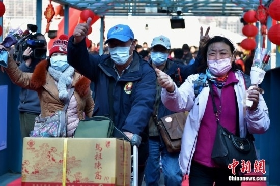 2月19日,搭載59名旅客的“吉順9號”客輪緩緩駛?cè)敫V葸B江黃岐客運碼頭,標(biāo)志著連江黃岐至馬祖白沙“小三通”客運航線復(fù)航。此前,廈門-金門客運航線、福州馬尾-馬祖客運航線、泉州-金門客運航線已相繼復(fù)航。圖為兩岸鄉(xiāng)親在黃岐客運碼頭激動相擁。中新社記者 張斌 攝