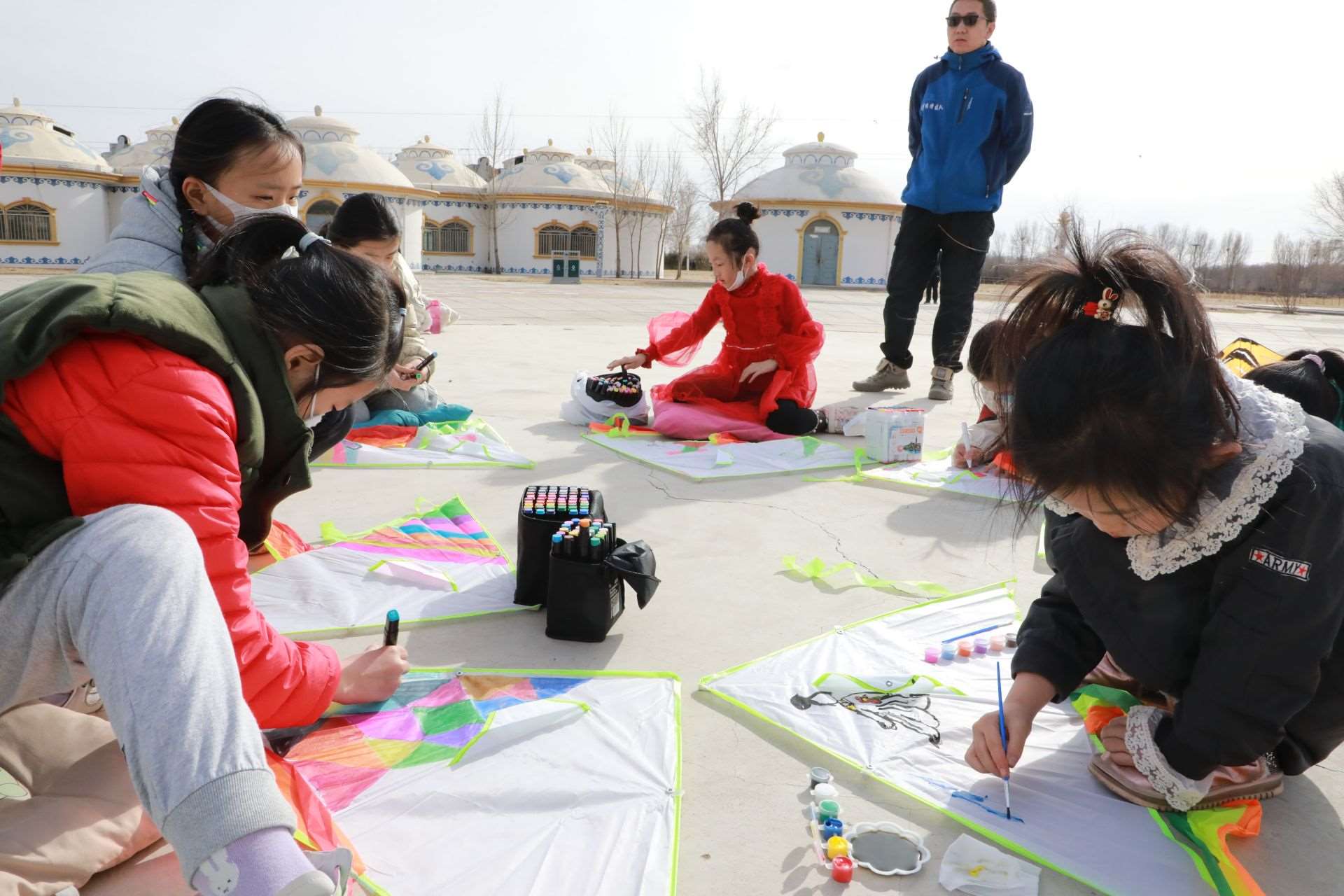 活動現(xiàn)場,呼和浩特市風箏協(xié)會還特地準備了20個空白風箏,讓孩子們充分發(fā)揮想象力,動手繪制自己喜歡的圖案。沐浴著溫暖的春光,小記者們拿出事先準備好的水彩筆或者顏料,或趴或坐,認真構思,有的在風箏上畫上了粉色的郁金香,有的畫上了振翅飛舞的蝴蝶,有的畫上了美麗的白雪公主,還有的涂鴉上喜歡的色塊,他們用五彩斑斕的顏色點綴創(chuàng)意,裝點自己喜歡的風箏。一個小時的功夫,一個個獨具創(chuàng)意的風箏在小記者們的巧手繪制中完成了。在郝偉老師的指導下,小記者們把風箏安裝好,接上線,舉行了一場小型風箏比賽?!巴郏晒α?,起飛了!”只見數(shù)十只色彩各異的風箏隨風飛上天空,你爭我趕,越飛越高,小記者們?nèi)滩蛔“l(fā)出歡呼聲,臉上洋溢著開心地笑容。