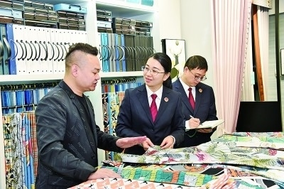 浙江省紹興市柯橋區(qū)被稱為“國(guó)際紡都”。2022年,柯橋區(qū)人民檢察院通過(guò)大數(shù)據(jù)監(jiān)督模型,監(jiān)督糾正62件花樣著作權(quán)虛假訴訟案件,入選2022年知識(shí)產(chǎn)權(quán)檢察十大案事例。圖為辦案人員在走訪商戶??聵騾^(qū)人民檢察院供圖