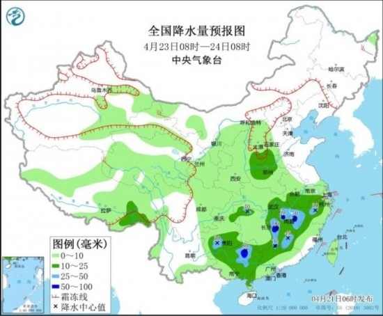 4月22日08時至23日08時,新疆沿天山高海拔地區(qū)和南疆南部、西藏東部、青海中南部、甘肅中南部、寧夏中北部、陜西中北部、山西等地部分地區(qū)有小到中雪或雨夾雪,其中甘肅中部、陜西北部、山西中南部等地部分地區(qū)有大雪;西藏東南部、華北南部、黃淮西部、江淮西南部、江漢南部、江南大部、重慶東北部、貴州東部、華南北部和南部等地部分地區(qū)有中到大雨,其中,湖南、江西中北部、廣西北部、廣東西北部等地部分地區(qū)有暴雨(50~90毫米)。西藏北部、江蘇北部等地部分地區(qū)有4~6級風(fēng)。東海北部海域、黃海南部海域、臺灣海峽將有5~6級、陣風(fēng)7級的東北風(fēng)。