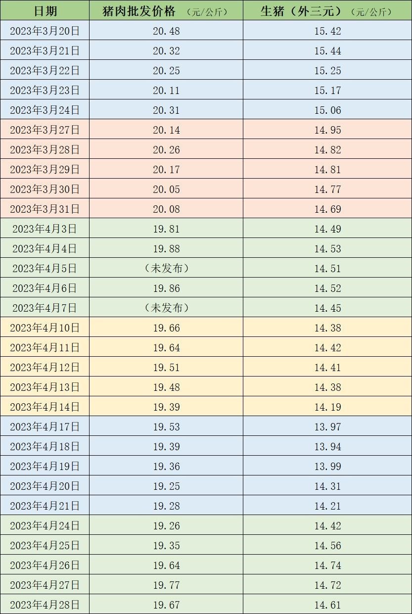4月24日,國家統(tǒng)計(jì)局發(fā)布2023年4月中旬流通領(lǐng)域重要生產(chǎn)資料市場價格變動情況。其中,生豬(外三元)價格為14.1元/公斤,與4月上旬相比,每公斤下降0.4元,下降幅度為2.8%。