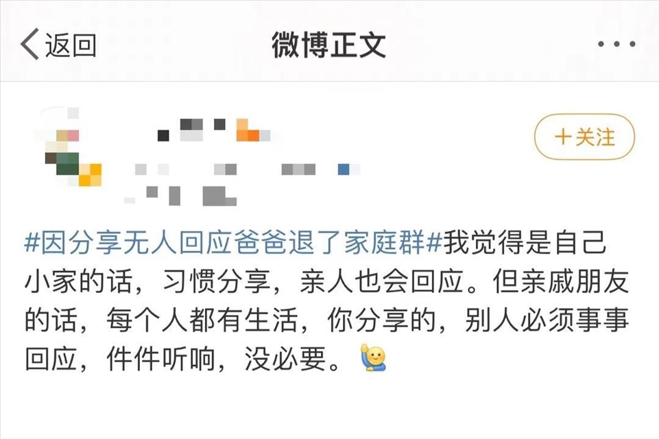 日前,一則“因分享無人回應爸爸退了家庭群”的話題引發(fā)公眾關注,登上熱搜。