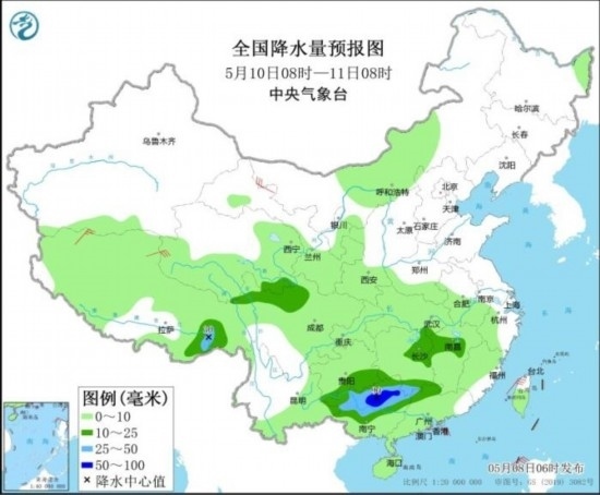全國降水量預(yù)報(bào)圖(5月10日08時(shí)-11日08時(shí))