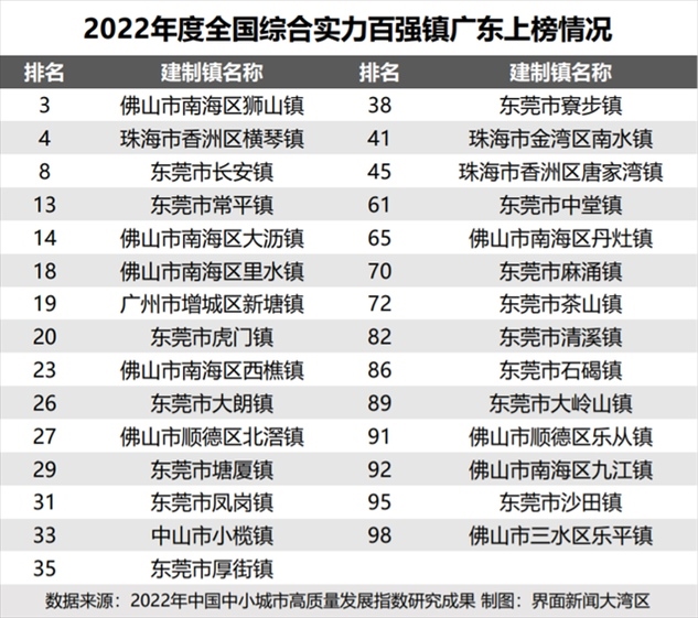 中國(guó)中小城市發(fā)展指數(shù)研究課題組、國(guó)信中小城市指數(shù)研究院去年發(fā)布的《2022年中國(guó)中小城市高質(zhì)量發(fā)展指數(shù)研究成果》顯示,在全國(guó)百?gòu)?qiáng)鎮(zhèn)名單中,廣東共有29個(gè)鎮(zhèn)上榜。其中,東莞虎門鎮(zhèn)位列全國(guó)第20名。