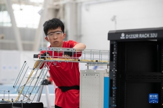 6月6日,選手在進(jìn)行信息網(wǎng)絡(luò)布線項(xiàng)目比賽。